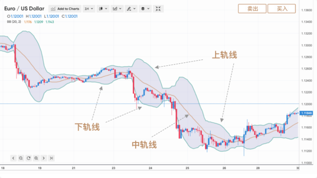 布林线由三条线组成,分别是:上轨线、中轨线和下轨线。中轨线是20周期简单移动平均线(SMA)。上轨线和下轨线在SMA线的两侧绘制,两者之间的距离由标准偏差确定。